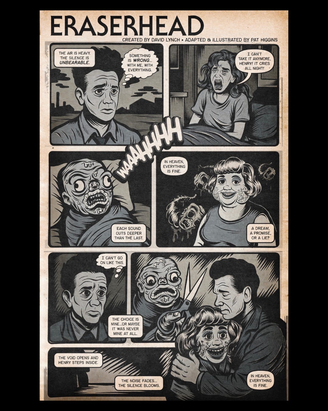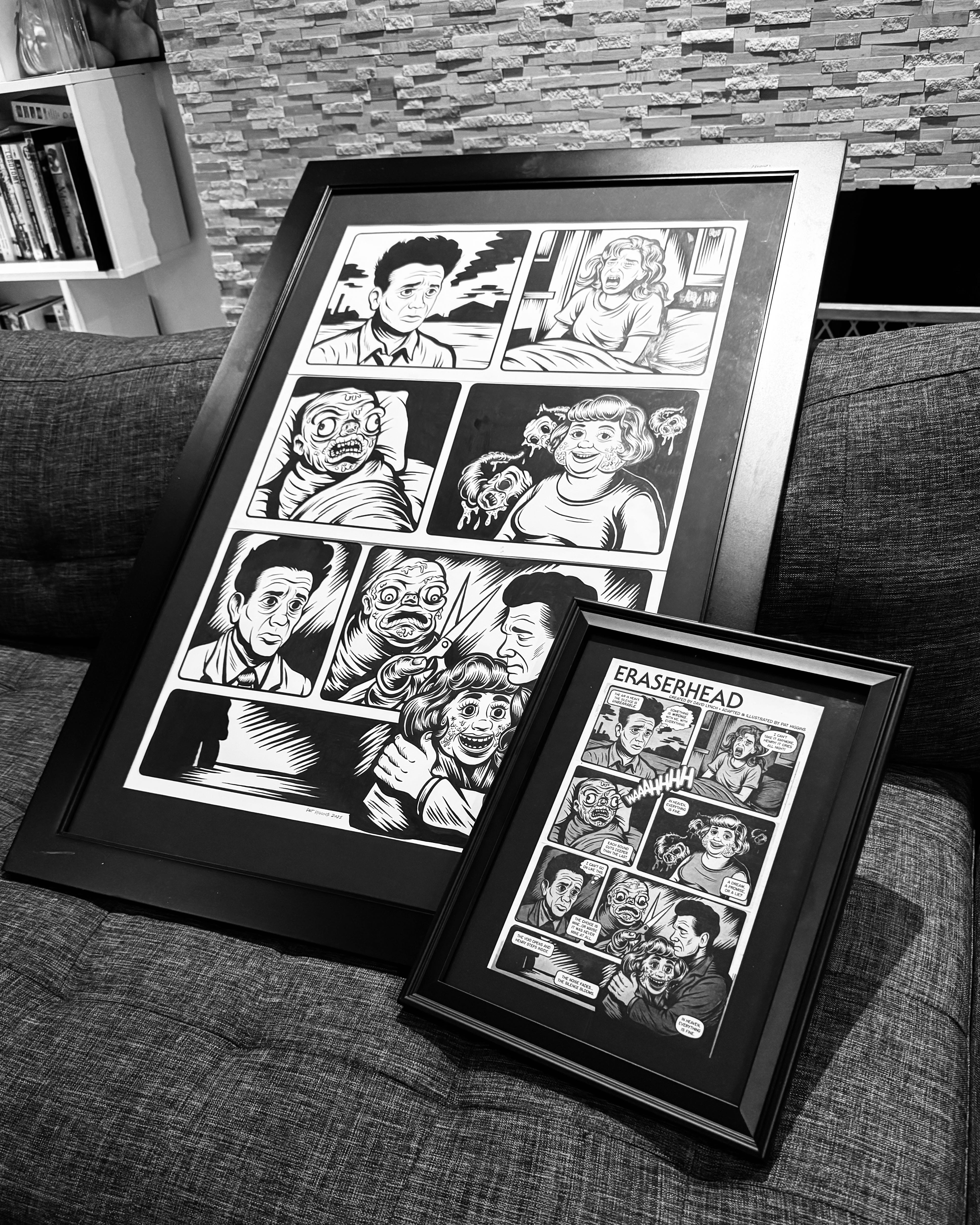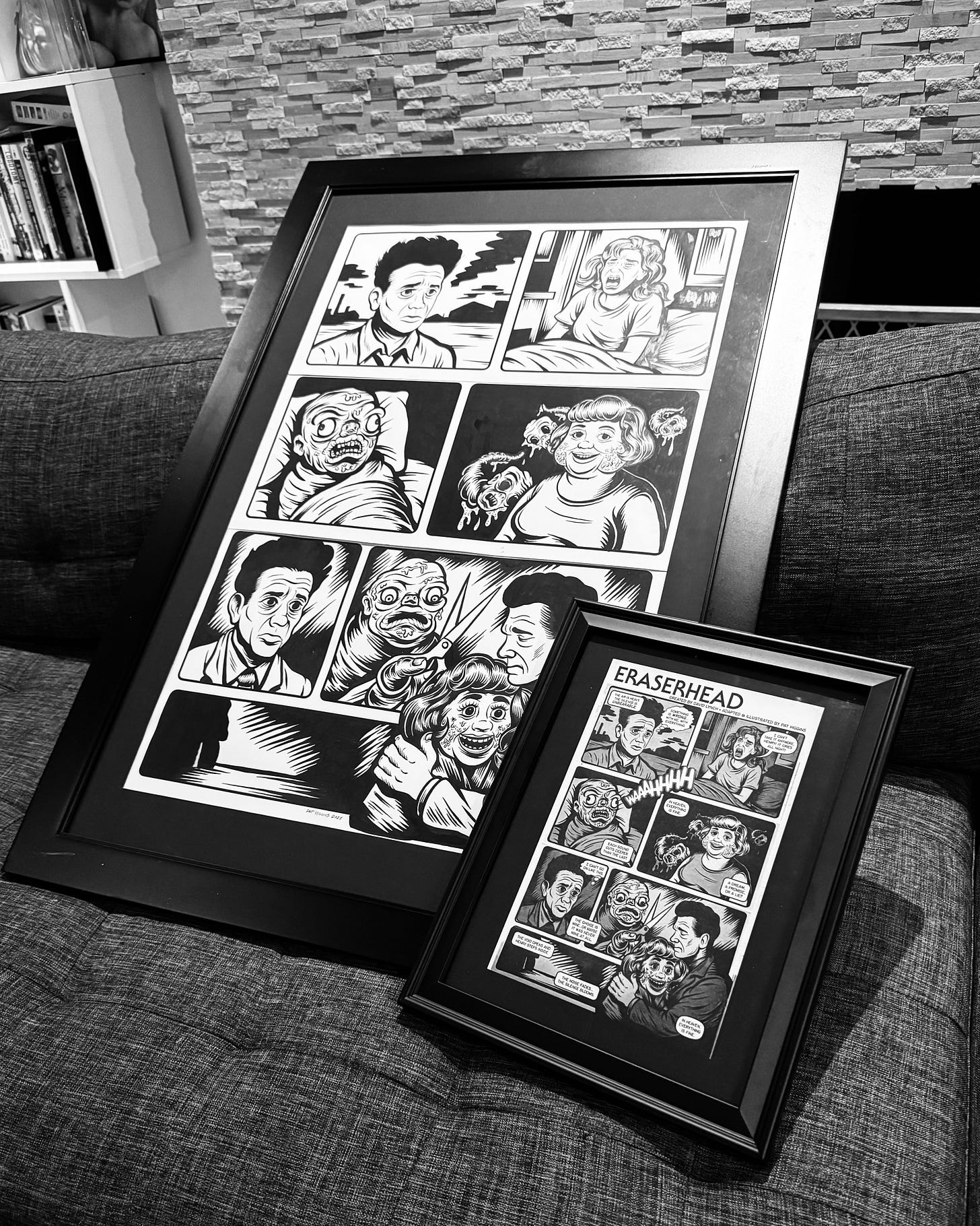 One of the most satisfying projects was a one-page adaptation of Eraserhead for a David Lynch tribute show at Talleyville Frame Shoppe in Wilmington, Delaware. I contributed two pieces: a large framed original (17” x 26”, ink on bristol) and a 9” x 12” print of the finished page.